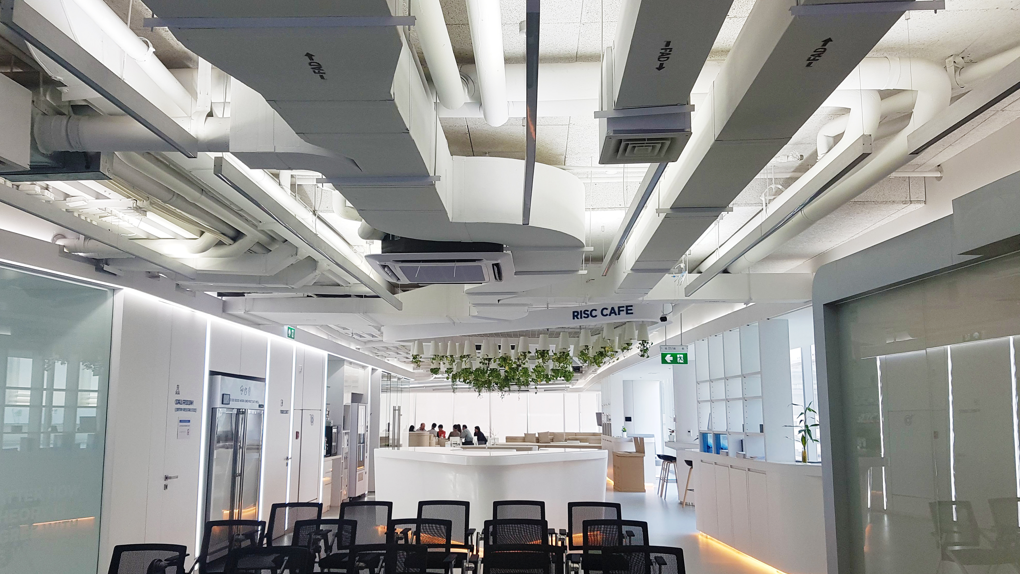 RISC itself uses some of these materials within the building; the interior walls and surfaces are made from upcycled buttons and eggshells, the café worktop contains anti-bacterial properties to maximise health and safety where food is handled, and the interior paint and décor is free of volatile organic compounds and formaldehyde. These are just a few examples of how the company office succeeds in being a sustainable and habitable environment for everyone working. Biophilic design is implemented from the Inspiration Hall through to the Café Zone, with vegetation being tested for its durability in an indoor environment, thereby learning which plants would be best suited to improving the air quality of the office, as well as productivity and positivity. With an indoor air-monitoring system and sensors in each zone of the office, the RISC team are able to track the internal air quality (IAQ), measuring temperature, humidity, particulate matter, total volatile organic compounds and CO2 levels. As my guide explained, since we no longer spend the majority of our time outdoors, we must bring the goodness of the outside in, to improve the air quality of the environment we now occupy the most.