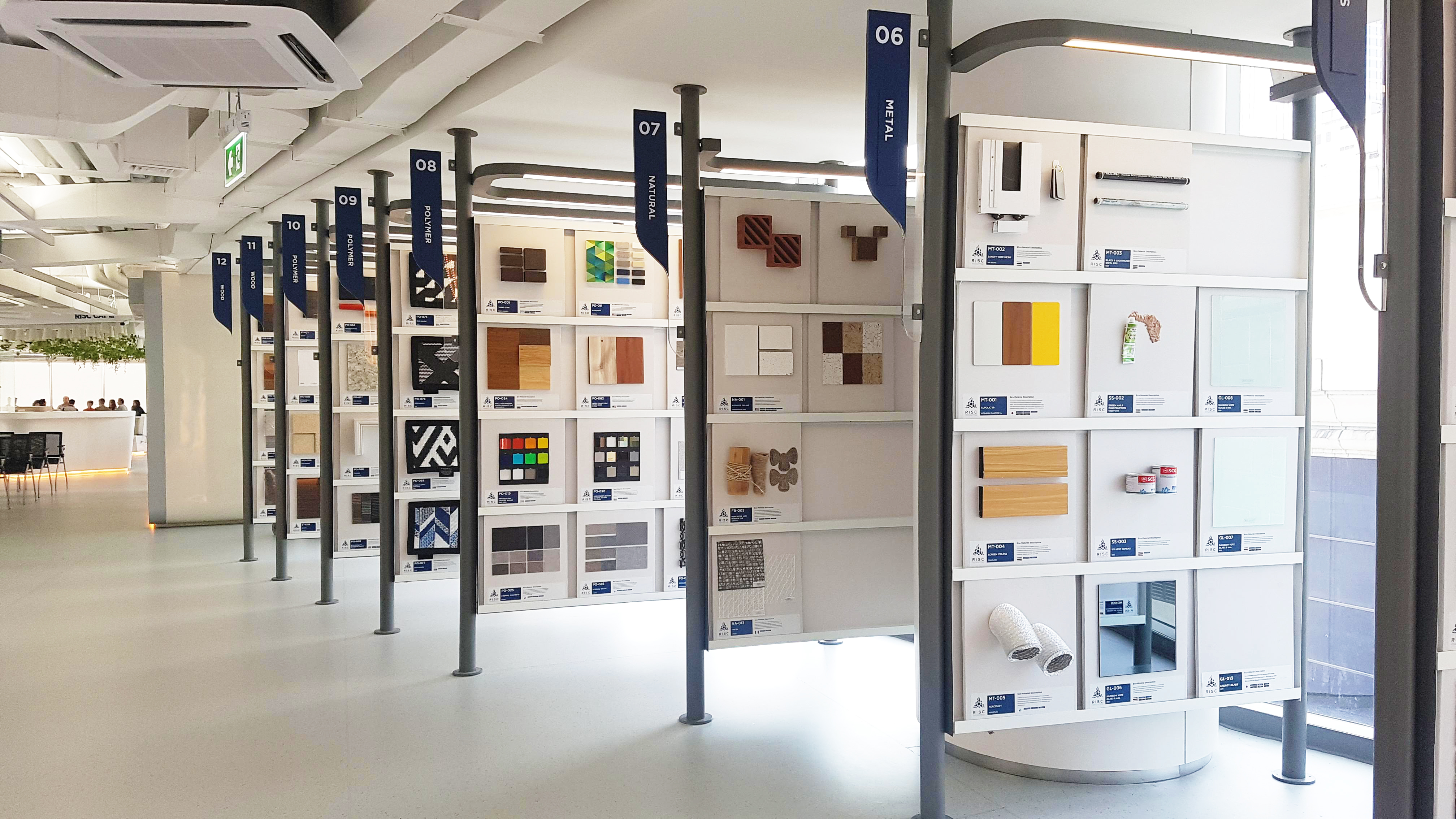 I met with one of the researchers and sustainable designers at RISC who was kind enough to show me around the office, explaining the function of each zone, beginning with the Eco-Material Library. While RISC have an extensive online library, they use this in-house space to showcase a selection of environmentally-friendly materials for visitors to see and feel. Mostly for construction purposes, all the materials have been produced using renewable energy sources and are designed to be non-toxic and sustainable, using recycled materials and reducing energy usage and waste. Architects, building planners and construction companies with the aim of producing WELL standard, socially and environmentally responsible buildings are able to find suppliers through RISC and subsequently use LEED certified materials.
