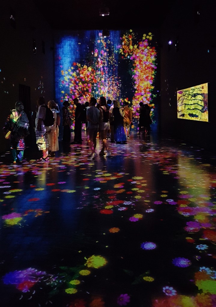This closed-off room is dark and atmospheric, with projectors beaming borderless digital animations of beautiful wildlife onto the walls and floor. The animations are not simply pieces of digital artwork, but with a mixed reality feature built in, it becomes an interactive experience. When a visitor stands in front of the waterfall, the virtual water “splashes” on their head and cascades down around them, like a real waterfall would. When visitors walk across the flowers, new flower shoots burst out from beneath their feet. When visitors touch the butterflies flying across the walls, the butterflies die and fall to the ground. It’s beautiful and poignant, drawing attention to the delicate balance of life and the connection between all living things.