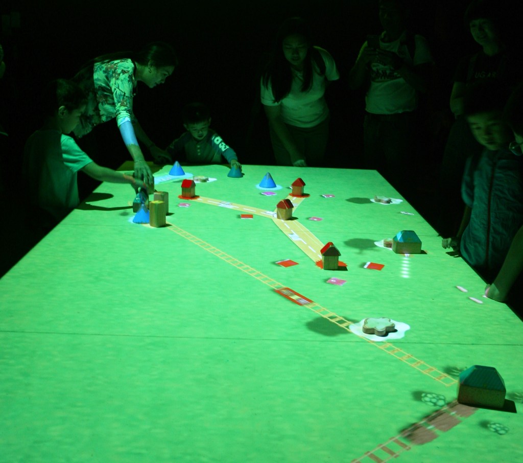 Train track towns are one of the most traditional toys dating back to the early 1900s, where you can building a train track and/or roads, decorate the surrounding area with houses and trees, and then populate your town with vehicles. The ingenious installation in the exhibition took this idea to the next level by incorporating a digital element. Using physical wooden blocks in the form of houses and stations as triggers, once placed on the ground, virtual roads and train tracks immediately appear connecting them. If two bridges are placed down for instance, a virtual river will appear flowing under them, two helipads will trigger a virtual helicopter to fly between them. Each time one connection point is moved, the virtual path adapts in accordance. It is a truly ingenious transformation, bringing an age old game into the digital realm.